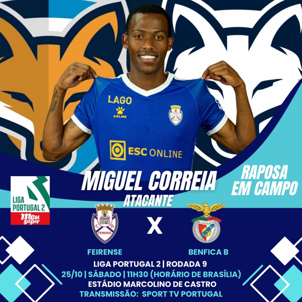 Já pela Liga Portugal 2, o atacante Miguel Correia está relacionado pelo Feirense, para enfrentar o Benfica B, às 11h30, no Estádio Marcolino de Castro, pela nona rodada da Liga Portugal 2.